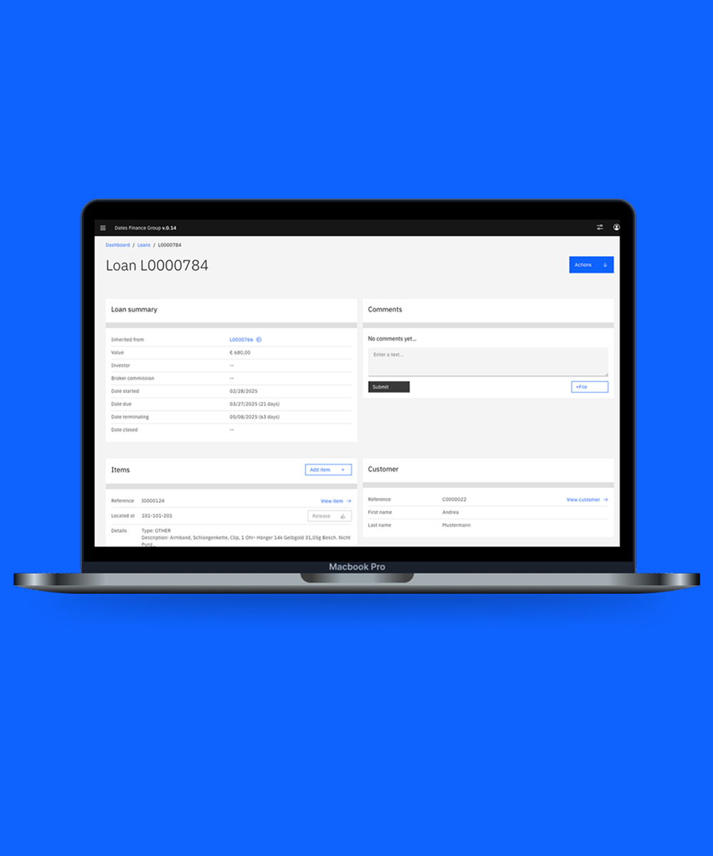 Point of sale system for private loans businesses covering the full range of business needs from customer database to documents generation and collateral inventory system.